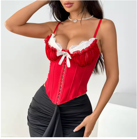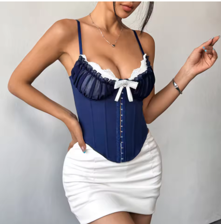 Sexy Y2K V-Neck Crop Top with lace patchwork design